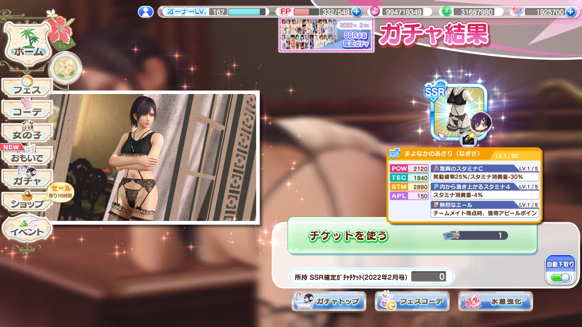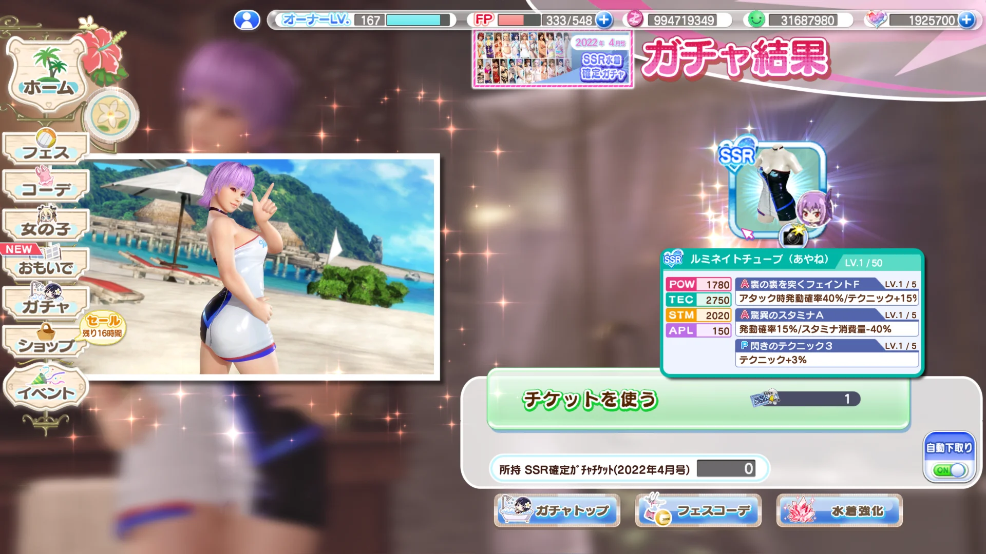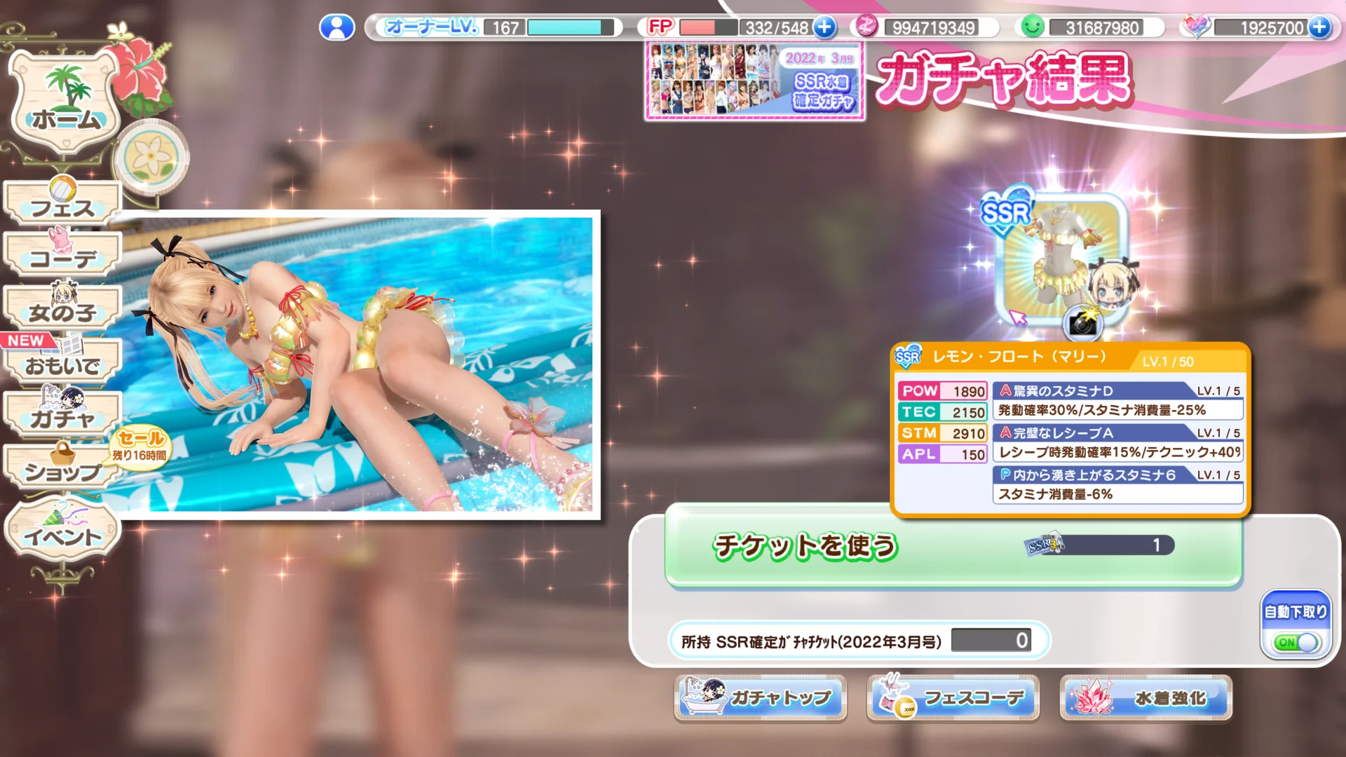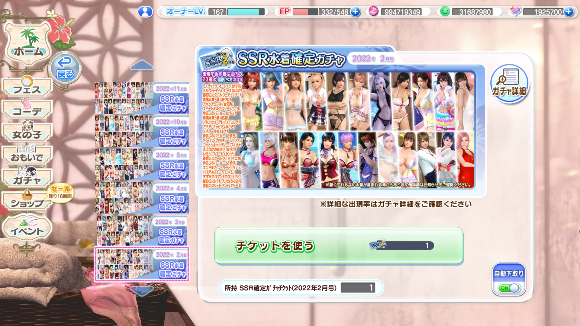 | 6月 | 「DEAD OR ALIVE Xtreme Venus Vacation」で、確定ガチャチケットが溜まっていて困っていた。 まだ2022年のが残っている。来年にはなんとか消費したい。
