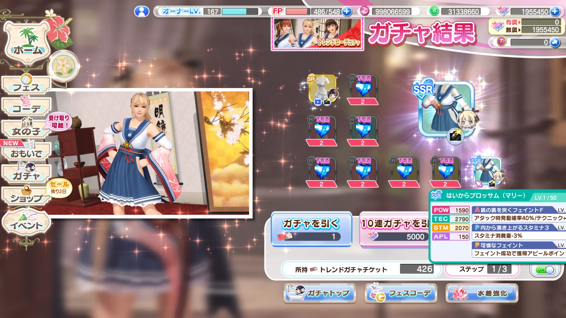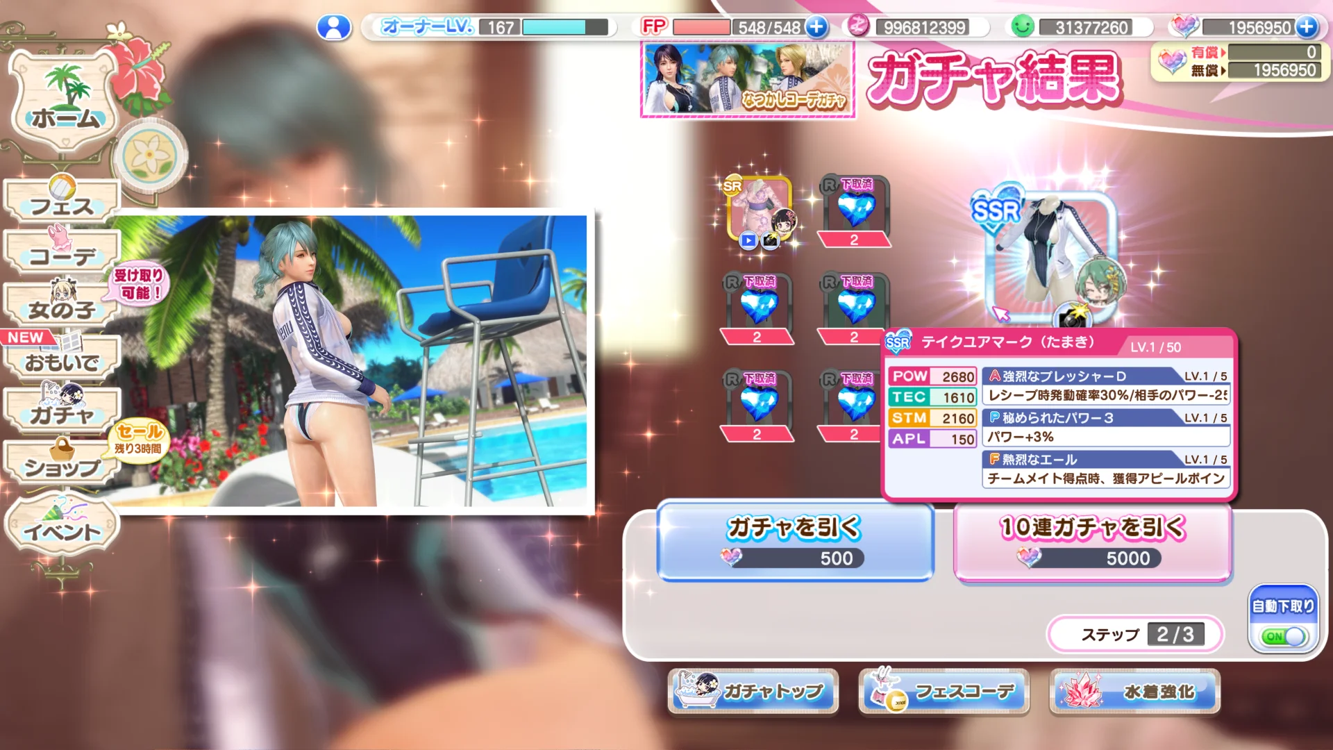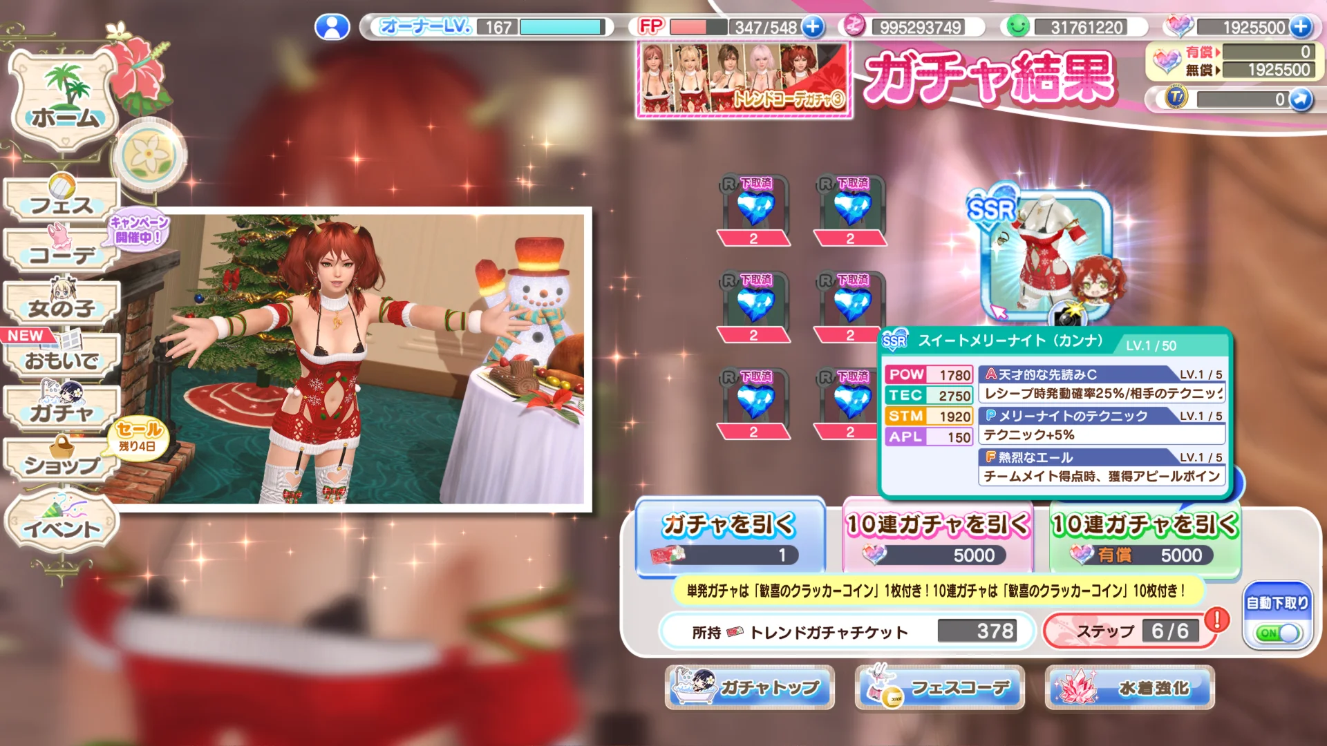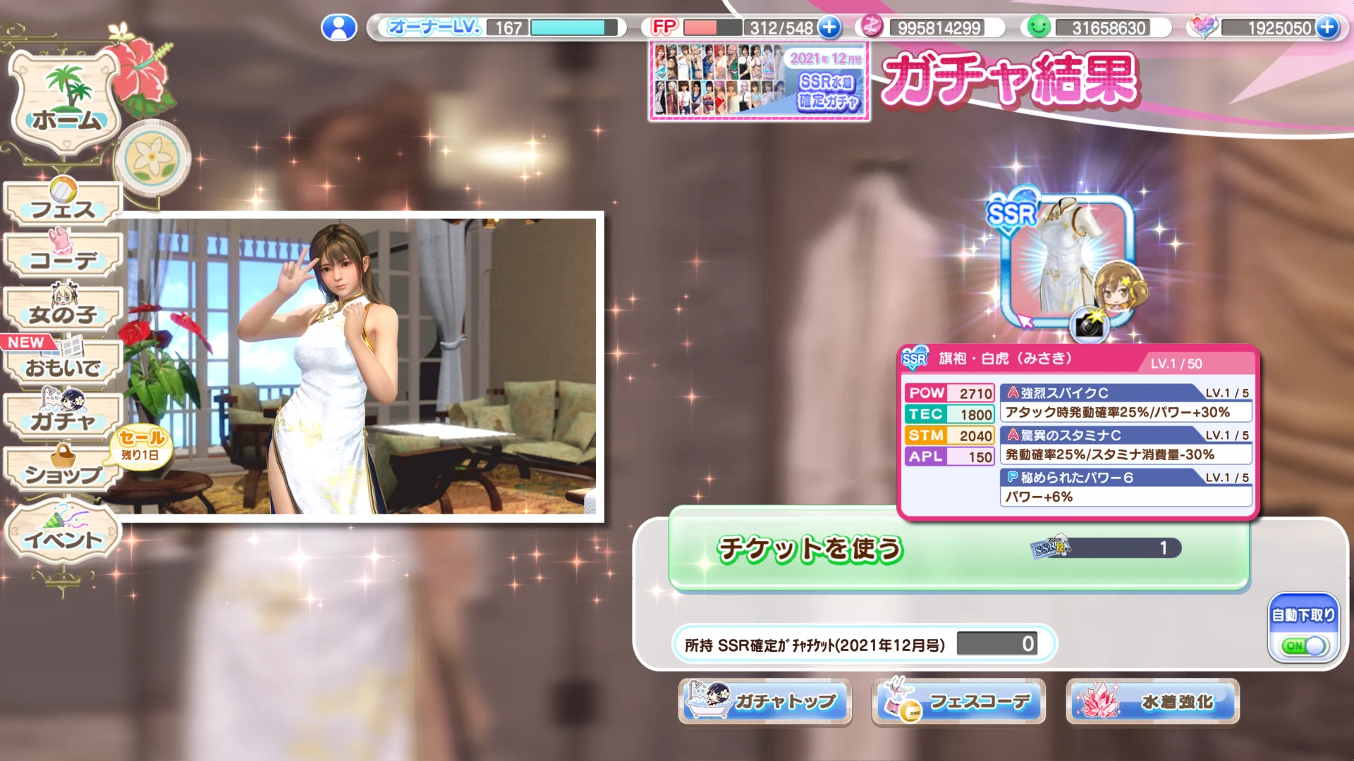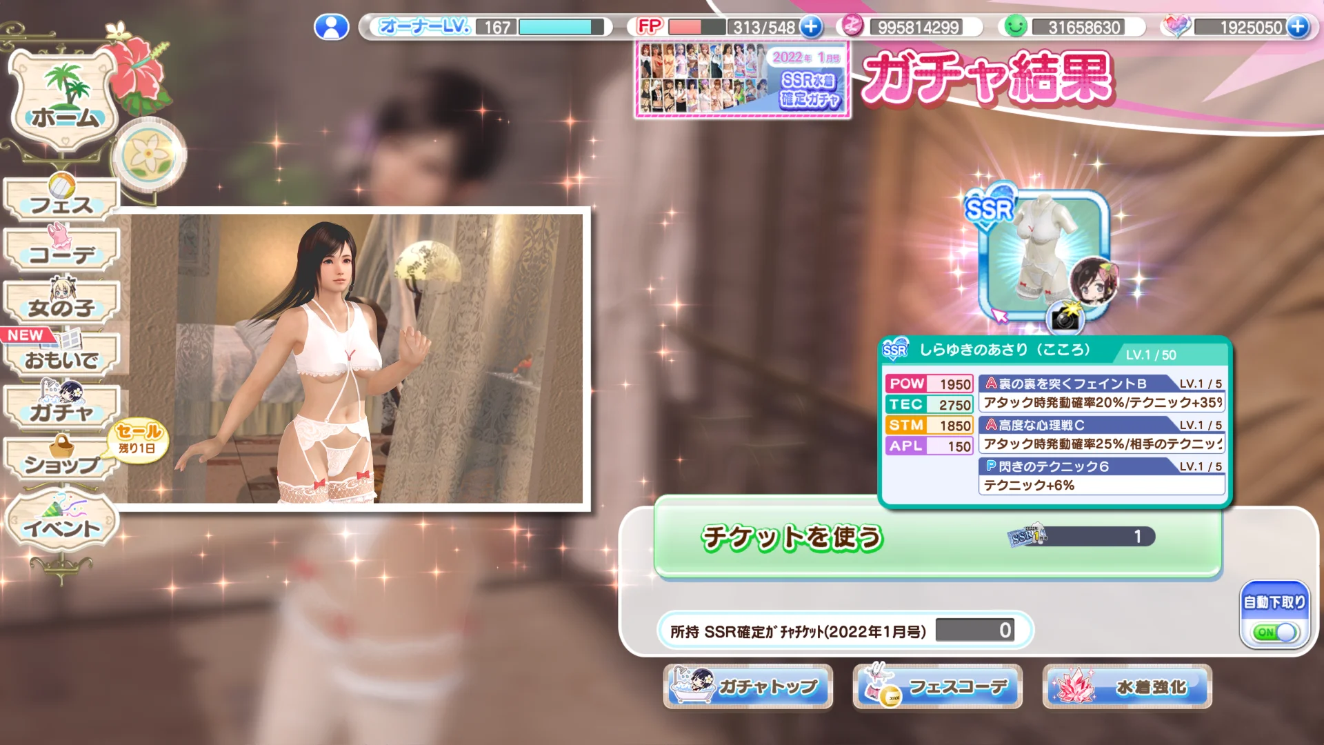 | 6月 | 「DEAD OR ALIVE Xtreme Venus Vacation」で、確定ガチャチケットが溜まっていて困っていた。 まだ2022年のが残っている。来年にはなんとか消費したい。