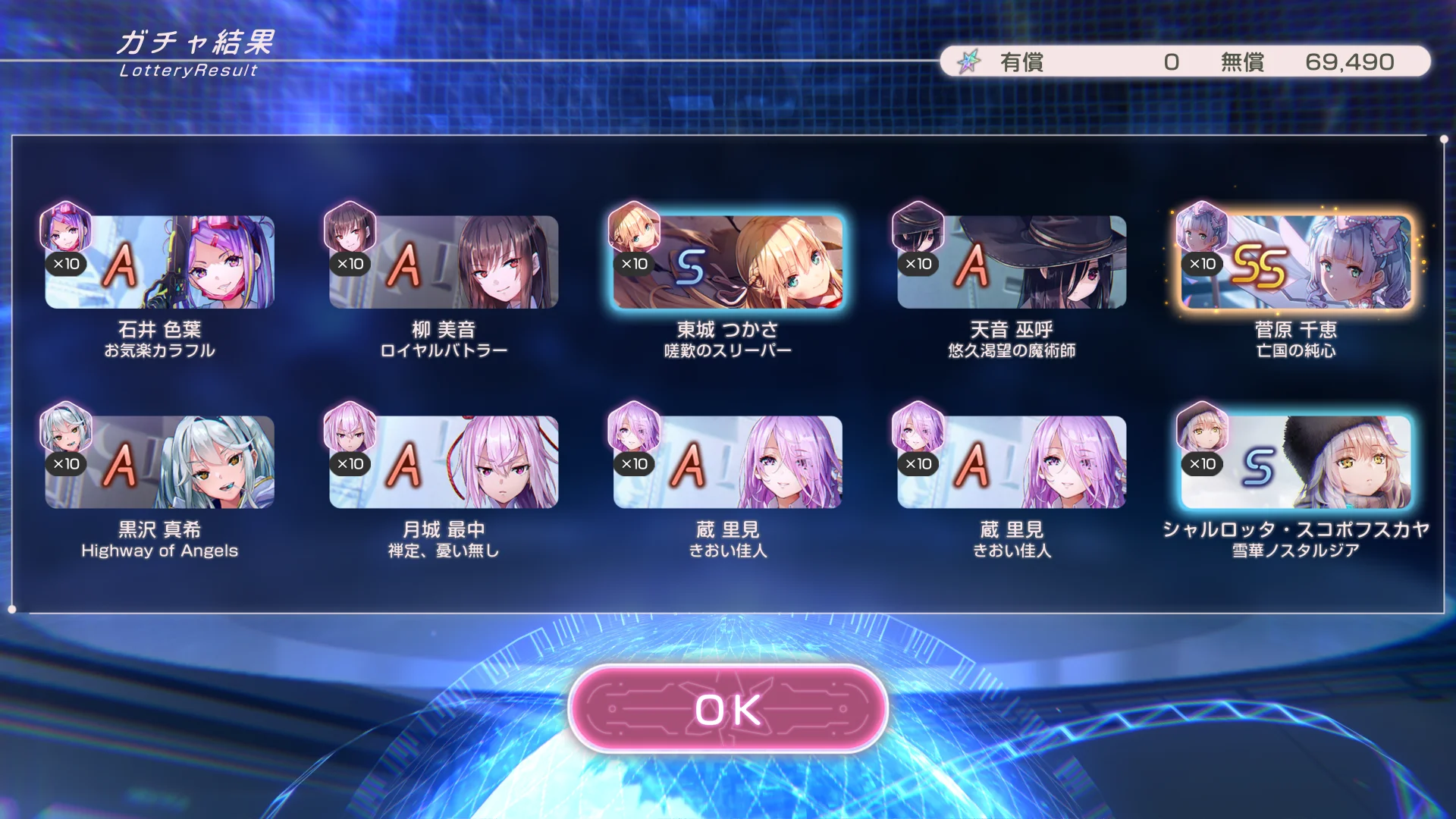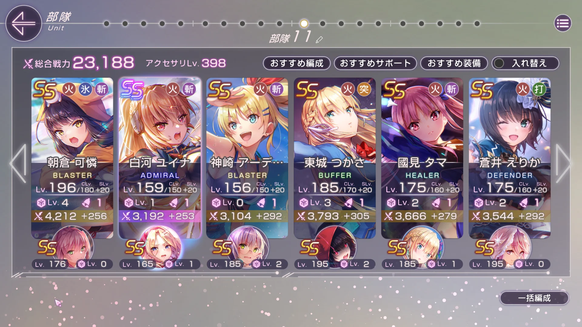 蒼井のスキルを利用していないからここにバッファーかでバッファーを配置するとよかったかも、と少し反省。この6枠目に戦闘に参加しないキャラを置いて全キャラ100万超えにしてあのランクを上げておくことができるけれど、40回も繰り返すなんてやりたくないですね。